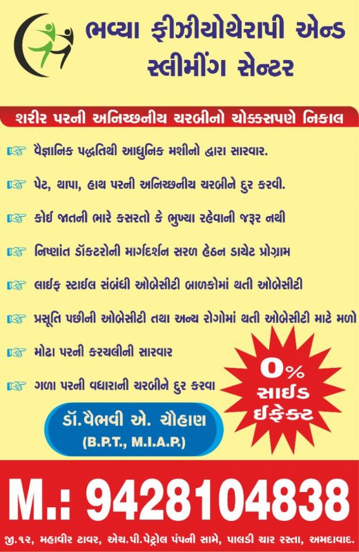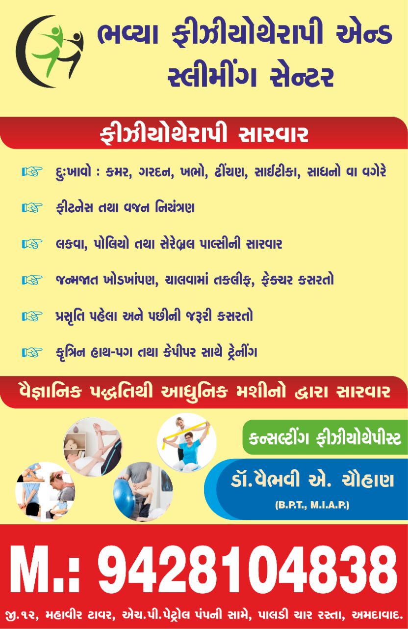 Bhavya Physiotherapy and Slimming Center is known for housing experienced Physiotherapists. Dr. Vaibhavi Chauhan, a well-reputed Physiotherapist, practices in Ahmedabad. Visit this medical health centre for Physiotherapists recommended by 50+ patients.