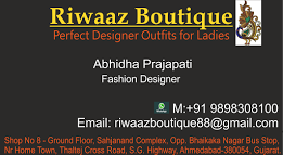 Listings >> Fashion Designers Riwaaz Boutique Thaltej Fashion designer +9198983 08100 www.riwaazfashionhub.in Write a review Review Add to favorites Favorite Address: Shop No 8 Ground Floor Sahjanand Complex, Opp Bhaikakanagar Bus Stop, Nr Home Town, Cross Road, S.G.Highway, Thaltej, Ahmedabad, Gujarat 380054 Phone: 098983 08100 Rate and write a review Cancel replyYou must be logged in to post a comment. Sponsers Is this your business?Claim it now.Make sure your information are up to date. Fashion Designers Mon-Sat-10am-8pm Sunday closed Photo gallery All photos (2) WORLD SPORTS CLUB (Join Now – Explore Your Future)